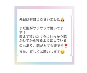 髪の毛が柔らかくなると、お客様は、自分の髪の毛じゃないみたいッてうれしそうな表情になります。